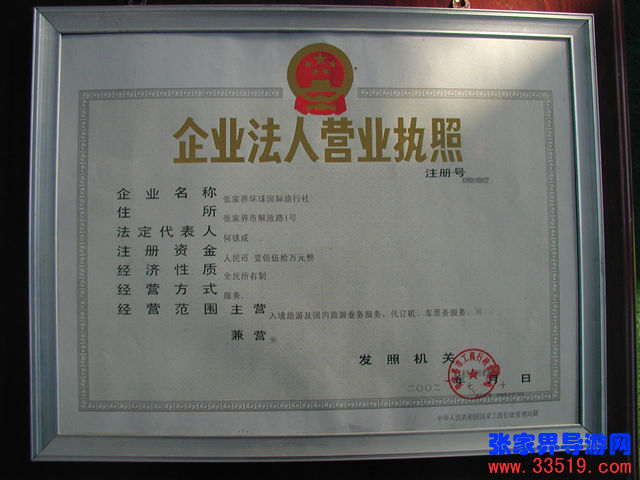 中國旅行社協會會員洙位 地址(Add): 湖南省張家(ch見n)界市東門橋環球國旅大廈8206 8207 郵編(P.C): 427000