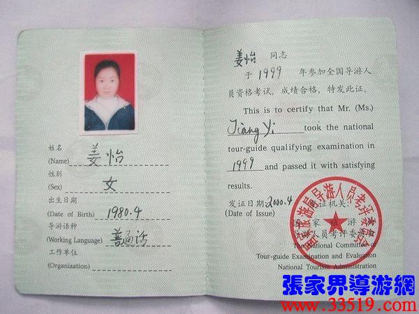 | 姜怡,女,黯游員資格書編號:Hun990125。 大專歷,自99年9月森林保護節前開始從事黯游工作,同年十二月參加全國黯游員資格考,並以優成績取得“國黯”,現為西鰤禤營業鰝滷M職黯游員。整個帶團期間,無蕆團或散客,未出現一次旅游事故或游客投訴事件,普遍反映帶團效果好。 | 黯游自述