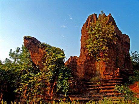 紅石林位于茄通和斷龍山鄉(xiāng)境內(nèi),方圓上萬公頃,精華景觀達(dá)數(shù)百公頃。那遍布的紅彩奇石造型各異,姿態(tài)萬千,或依山而立,或拔地而起,古樸秀雅,氣勢(shì)宏偉,身臨其境,恍如仙境。一尊高 12.6米的擎天石柱,猶如一東方巨人,指點(diǎn)江山;巨石對(duì)面,另一石則婀娜多姿,秀麗動(dòng)人。另有一山頭遍布紅石,或高或低,或長或短,游人入此,頓覺撲朔迷離,難覓來路。入另一處石林,但見如墻似垣,高度不大,但排列組合得與樓蘭古城布局相差無幾。這里所有的石頭都披著一層細(xì)密的皺褶,如珊瑚礁一般,讓人想起幾萬年前這里是一片浩闊的大海,海浪時(shí)時(shí)轟鳴著一波波沖擊著礁石。