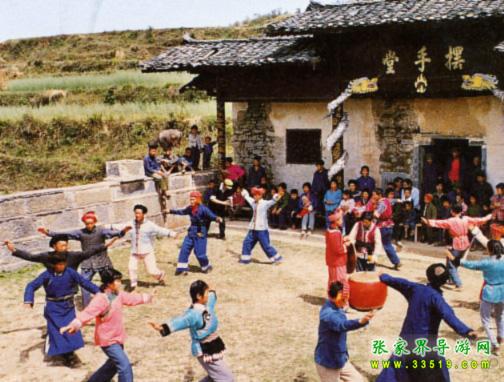 “茅古斯與擺手舞”是土家族紀念祖先開拓荒野、捕魚狩獵等創(chuàng)世業(yè)績的一種原始戲劇形式,被中外的戲劇界稱為是人類戲劇文化的“活化石”,茅古斯是土家族最古老的舞蹈,也是傳授狩獵技藝的民間武術(shù),體現(xiàn)土家族先民的生活情態(tài)。