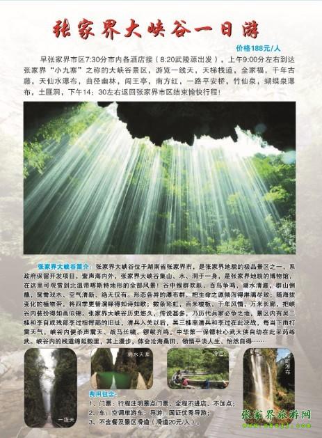 張家界大峽谷位于湖南省張家界市,是張家界地貌的極品景區(qū)之一,系政府保留開發(fā)項目,蜚聲海內(nèi)外,張家界大峽谷集山、水、洞于一身,是張家界地貌的博物館,在這里可觀賞到北溫帶喀斯特地形的全部風(fēng)景!谷中猴群歡躍,百鳥爭鳴,湖水清澈,群山倒蘸,鴛鴦戲水、空氣清新、絕無僅有。形態(tài)各異的瀑布群,把生命之源傾瀉得淋漓盡致;隨海拔變化的植物帶,將四季更替演繹得如詩如歌;數(shù)條彩虹,百米梭板,千年風(fēng)情,萬米長廊,把峽谷內(nèi)裝扮得如畫似錦。張家界大峽谷歷史悠久,傳說甚多,乃歷代兵家必爭之地,景區(qū)內(nèi)有吳三桂和李自成殘部李過指揮部的舊址,清兵入關(guān)以后,吳三桂率清兵和李過在此決戰(zhàn),每當(dāng)下雨打雷天氣,峽谷內(nèi)便殺聲震天、戰(zhàn)馬長嘯、鑼鼓齊鳴。中華第一保鏢杜心武大俠自幼在此采藥練武。峽谷內(nèi)的棧道綿延數(shù)里,其上漫步,體會滄海桑田、領(lǐng)悟平淡人生、怡然自得。