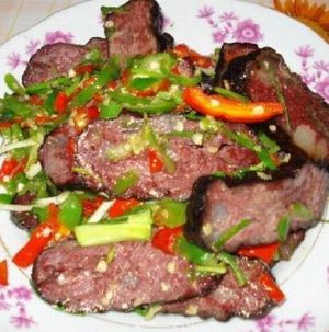 名稱: 血豆腐 介紹: 血豆腐,就是將豆腐和豬血、豬肉及花椒、辣椒等佐料拌成泥狀,捋成卵形,以竹篩置火炕上,煙熏烤成臘黃,吃起來耐嚼味香,是土家特色菜,當(dāng)?shù)厝顺R云湎戮啤?在張家界的飯館里很難吃到正宗的土家特色菜,可以去做土味的特色餐館去解解饞。但是最正宗還是鄉(xiāng)下人家家里自己熏的,那才叫一個(gè)好吃?。?!