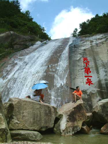 水簾洞瀑布源頭,在紫蓋峰的泉水。三支泉水匯集一起,流入水簾洞上方谷地。谷地闊三丈,原是梁朝的九位真人白日飛升的棲息之地,后建造九仙觀(guān)。九仙觀(guān)附近有太陽(yáng)泉、洗心泉、洞真源、仙人池等。相傳泉水深不可測(cè)。泉水從石壁上飛流直瀉,發(fā)出雷鳴般的聲音,聲傳十里。明朝張居正游此地后說(shuō):“瀑泉灑落,水簾數(shù)疊,掛于云際,垂如貫珠,霏如削玉”。確實(shí),它從絕壁上噴瀉下來(lái),寬達(dá)三太,高五十余米,瀉珠濺玉,仿佛一幅巨大的白布簾,在石壁當(dāng)中被亂石嶙巖擋住,然后再?gòu)氖p里屈曲折射,跳躍出來(lái),滿(mǎn)谷水花四濺,閃爍著晶瑩奪目的光彩。水簾絕壁下的碧潭,天上的云彩和兩邊的蒼翠的山巒,構(gòu)成一幅美麗的山水畫(huà)。明朝張居正作《水簾洞》一贊道:“誤疑瀛海翻瓊浪,莫擬銀河倒碧流;自是湘妃深隱處,水晶簾掛五去頭”。這首詩(shī)可說(shuō)是寫(xiě)出了水簾洞的光、聲、影三絕的奇景了。