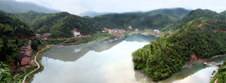 乘船溯源而上,一座垂釣休閑、功能齊全的“村莊”豁然呈現(xiàn)在我們眼前,那就是在開發(fā)建設(shè)中的白泥度假村。四面青山環(huán)繞,一座座裝飾雅致的小木屋鑲嵌其中。木屋旁邊清波鱗鱗,魚群嬉戲水中,依稀可見。