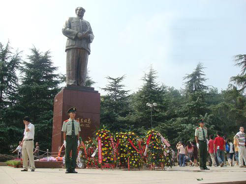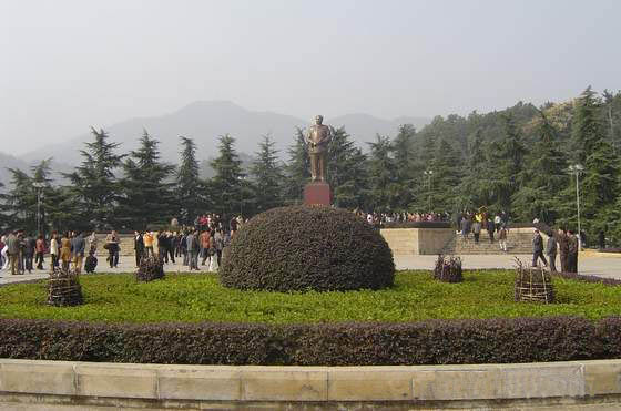 毛澤東銅像位于韶山沖的中心,紀(jì)念館、毛氏宗祠與韶山賓館之間。銅像區(qū)占地5200平方米,是經(jīng)中共中央批準(zhǔn)興建紀(jì)念毛澤東同志誕辰100周年的重點(diǎn)獻(xiàn)禮工程。這里原是一片沃野,地勢(shì)平坦開(kāi)闊,周圍群山拱護(hù)。韶蜂在遠(yuǎn)處,高峻挺拔,云富坨大山巍峨雄壯,十八羅漢山逶迤綿長(zhǎng),黑石寨鐵骨錚錚。在山的襯托下,銅像更顯得氣勢(shì)磅礴。