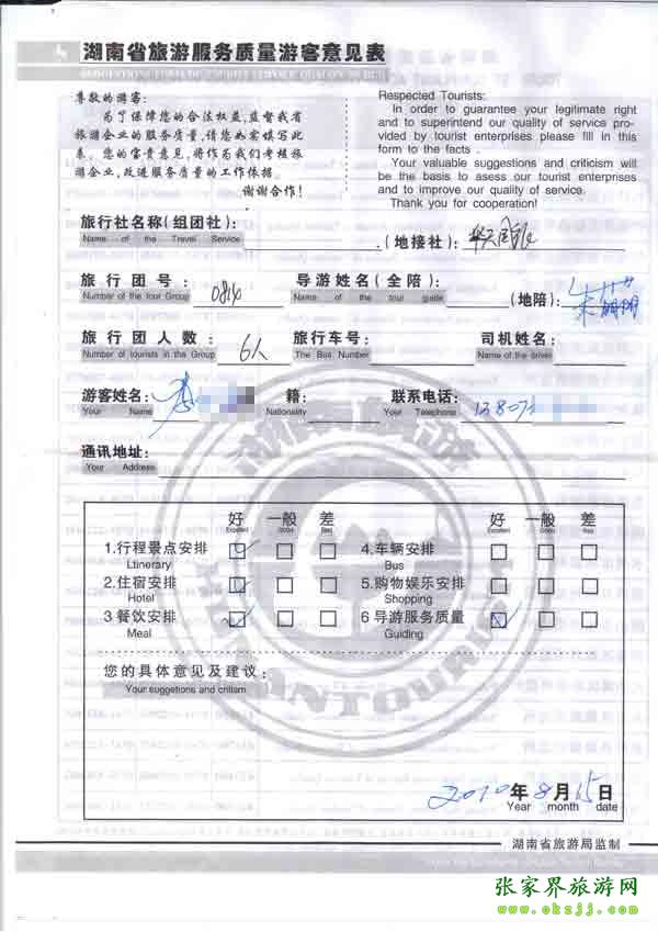 2010年8月15日岳陽(yáng)李先生一行六位旅游質(zhì)量反饋