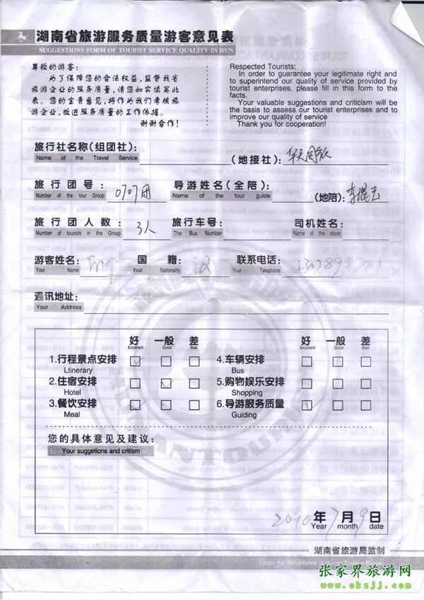 2010年7月9日昆明邱先生一行3位旅游質量反饋