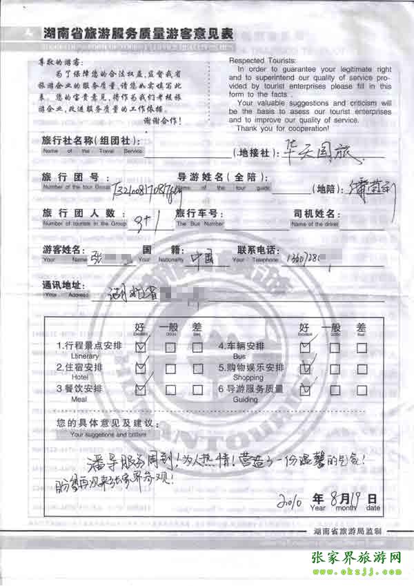 2010年8月19日湖北張先生一行九位旅游點(diǎn)評(píng):導(dǎo)游服務(wù)周到熱情,盼下次再來(lái)張家界