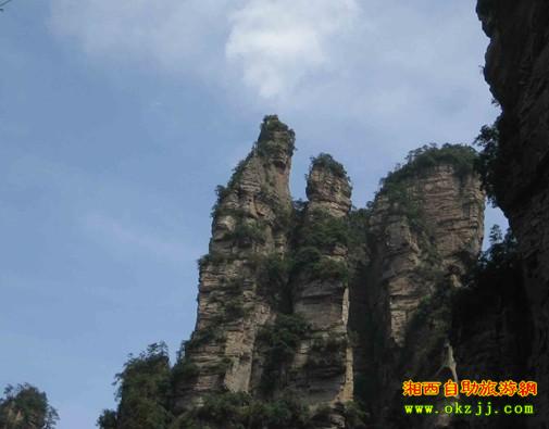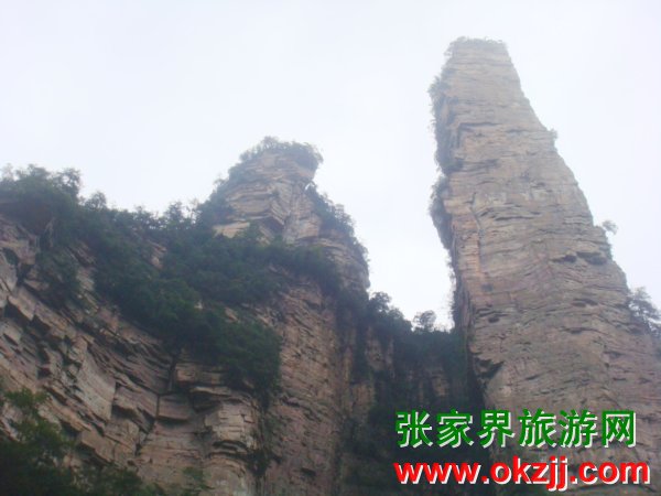 什么?有人說夫妻巖是兩個石頭啦。那旁邊的那個石頭是第三者?我暈,佩服你們的想象力啊。夫妻巖位于黃石寨對面山頭,張家界山莊后,在田家臺的對面,有兩個自然生成的山峰。這山也真奇,一個象男,一個象女,頭挨著頭,身靠著身,有眼睛,有鼻子,有頭發(fā),有嘴唇,就連眉毛與牙齒,也看得清清楚楚,明明白白。他倆站在高山,立在神地,相親相愛,永不分離。相傳,這是花仙山荷花與養(yǎng)蜂人田花郎歷盡千辛萬苦,幾度起死回生結合而成的,如遇自己的紅顏知己,可以去此處看看,許下心愿可保夫妻和睦,家庭幸福。