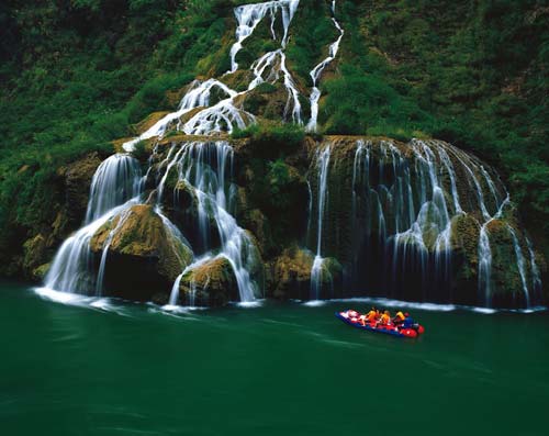 在金鞭溪游覽過程中,可見一組奇峰,有兩座較高的石峰緊密相連,下半截連為一體,上半截一高一矮,高者略欠身,低者稍后仰,好一幅相愛擁抱的絕妙畫面,恰似一對久別重逢的夫妻,故名相會峰,亦稱千里相會。相傳東海龍宮小龍女常來此地觀賞風景,一次偶然的機會,結識了峨眉山遠道而來的后生,二人情投意合,很快便產(chǎn)生了愛情。龍王知道此事以后,非常惱怒,決意拆散二人,多次將小龍女關在龍宮,但小龍女想方設法逃出來,常常與情人相會。龍王一氣之下,將二人點化成石,便成石峰“千里相會”。 十一、茅巖河漂流
