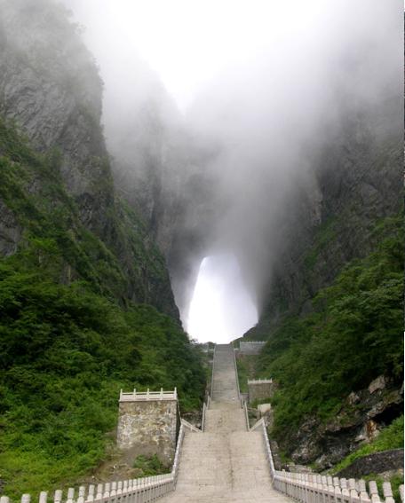 天門山上有一個(gè)天門洞,2006年03月,曾有俄羅斯之戰(zhàn)斗機(jī)在此表演飛躍天門洞的表演,還造成滿大的轟動(dòng)。上天門洞之前,必須先征服999個(gè)階梯,經(jīng)過一番努力終于登上天門洞之后,突有豁然的感覺,人在山上,卻仍然在洞中,從這里更可以鳥瞰整個(gè)張家界市的景色。用完晚餐后,即乘車從張家界回車長(zhǎng)沙。